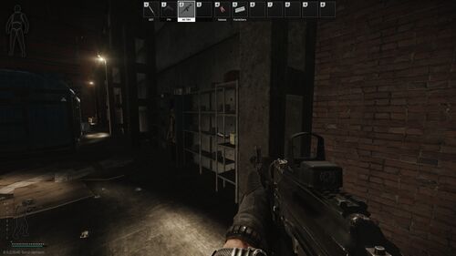 Tarkov はリアリスティックハードコアなので、マガジンの残弾数表示はありません。弾を撃ったり拾った武器はこういう表示になる。 "残弾をチェックする" 動作があって、デフォルトでは ALT + T にバインドされている。右下に "Full" とか表示される(ウォータ…